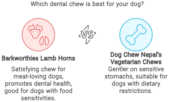 Barkworthies Lamb Horns remove plaque and tartar, promoting dental health. However, for dogs with stomach issues, vegetarian chews like the ones from Lekali Dog Chew Nepal might be better.